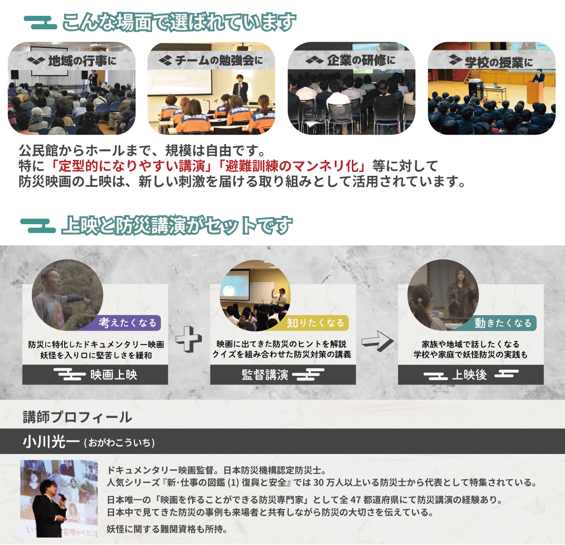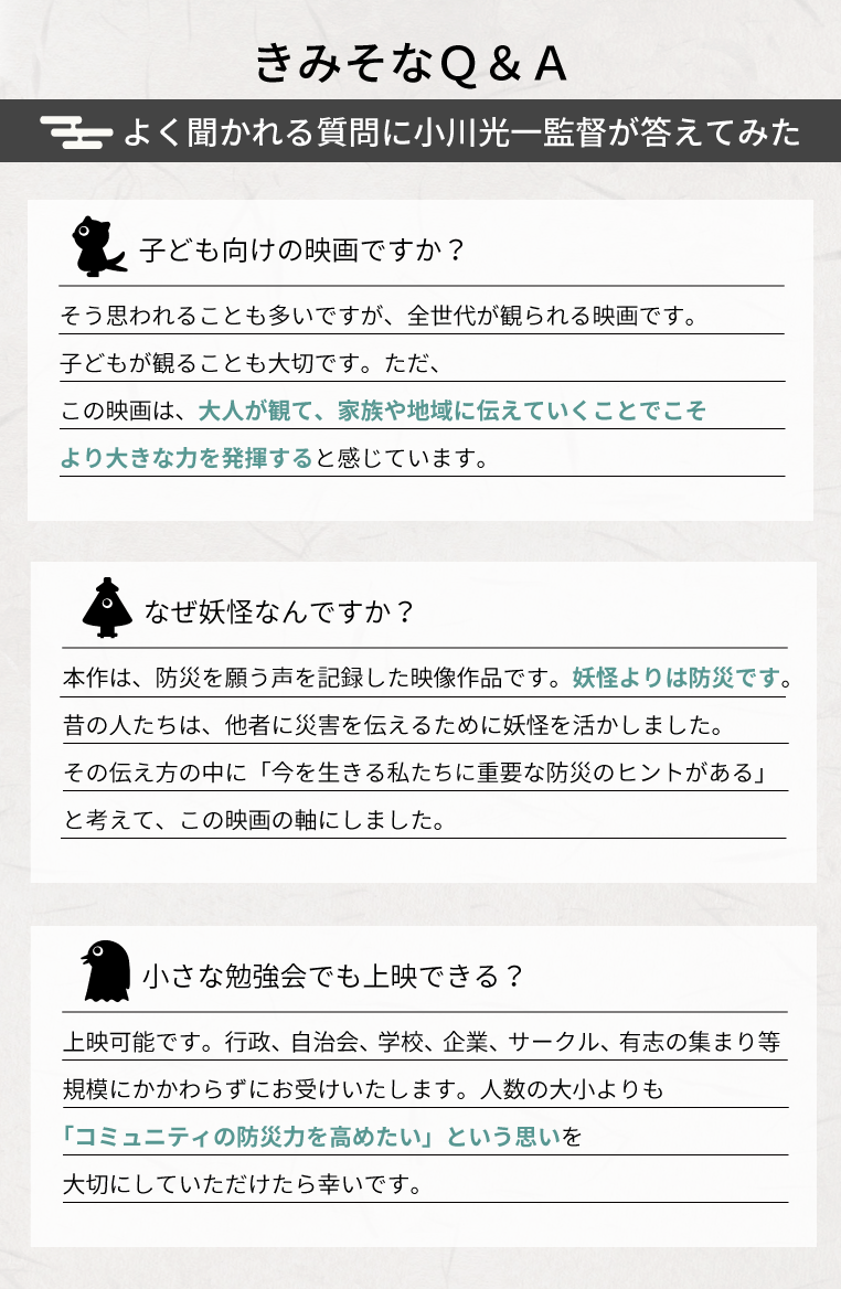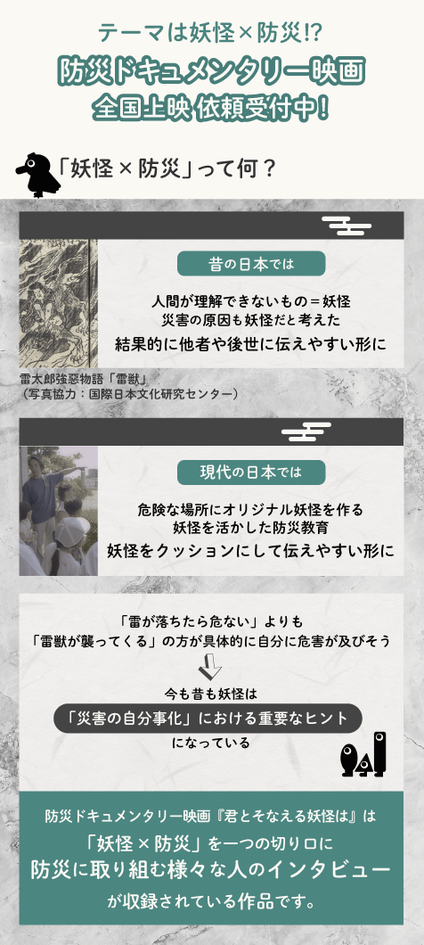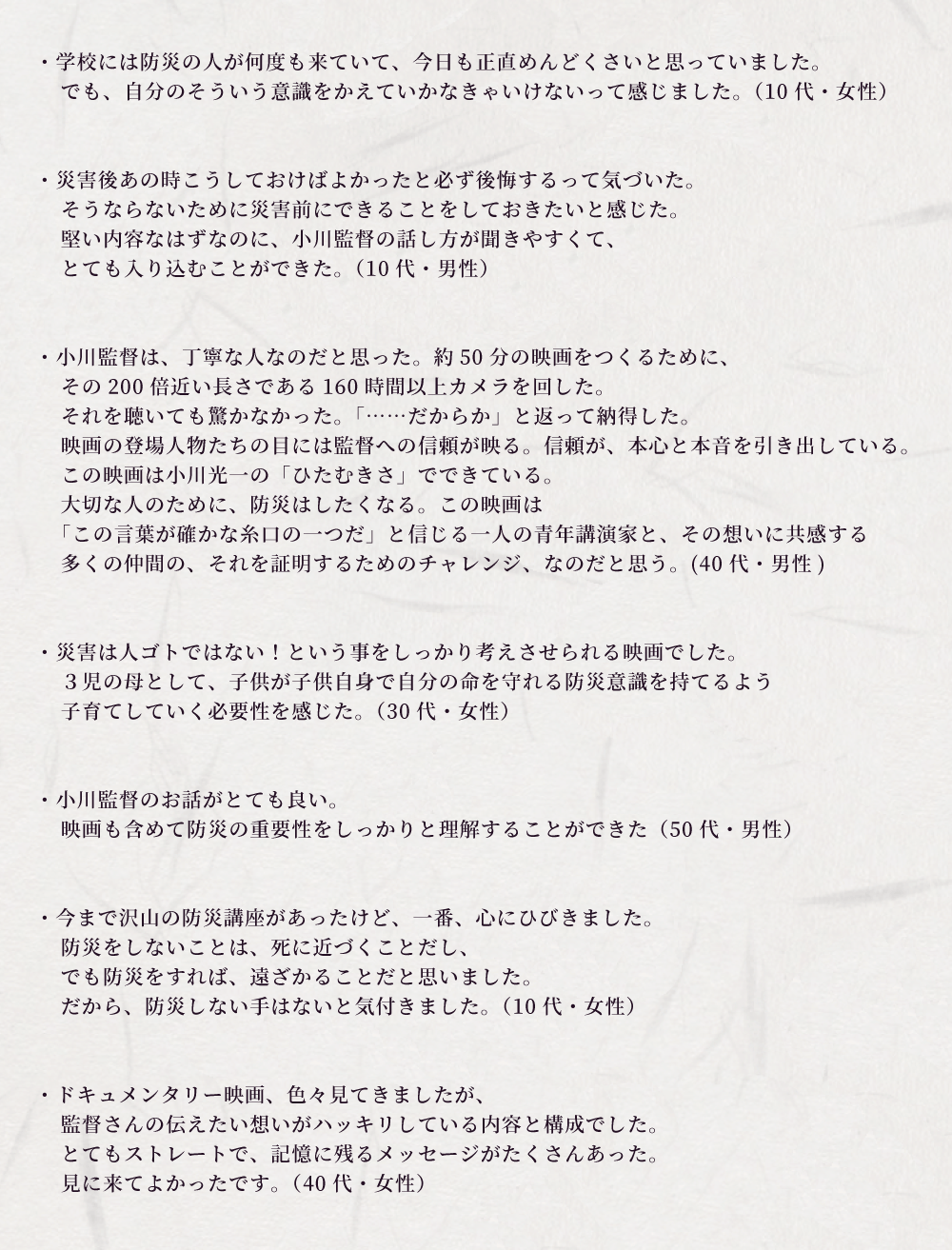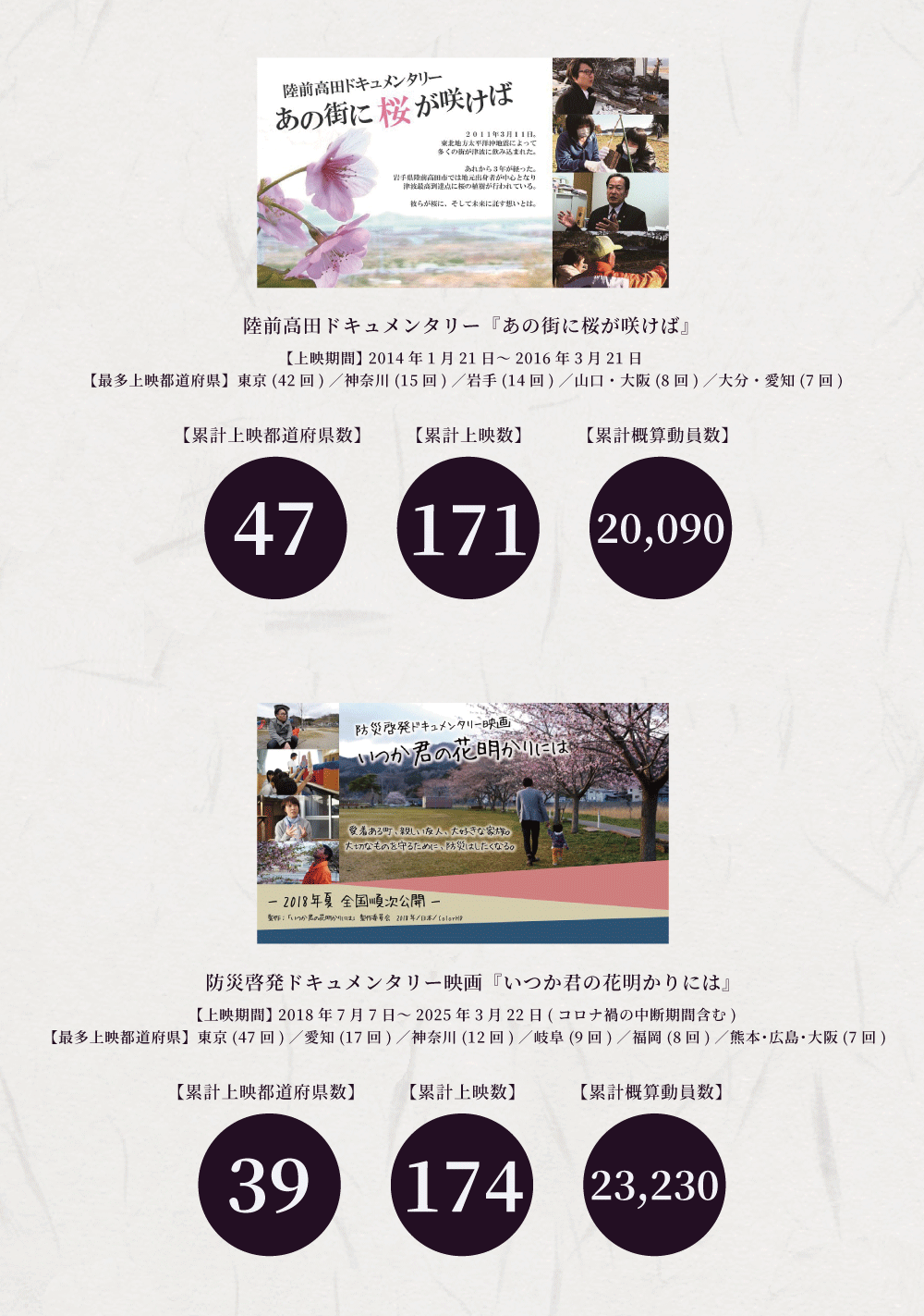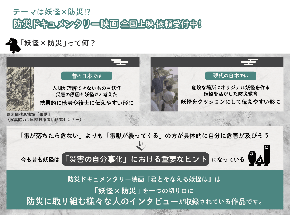 同製作チームが以前に公開していた防災ドキュメンタリー映画二作品の上映データを掲載いたします。今後の全国上映における規模等の参考にしてもらえたら幸甚です。また、前作品『いつか君の花明かりには』の感想の一部を掲載いたします。今回のテーマは「妖怪×防災」ではありますが、「大切な人とこれからも生きていくために防災してほしい」という根本的な姿勢は前作から変わっておりません。今作も温かい温度で防災を伝えられるように努めて参ります。