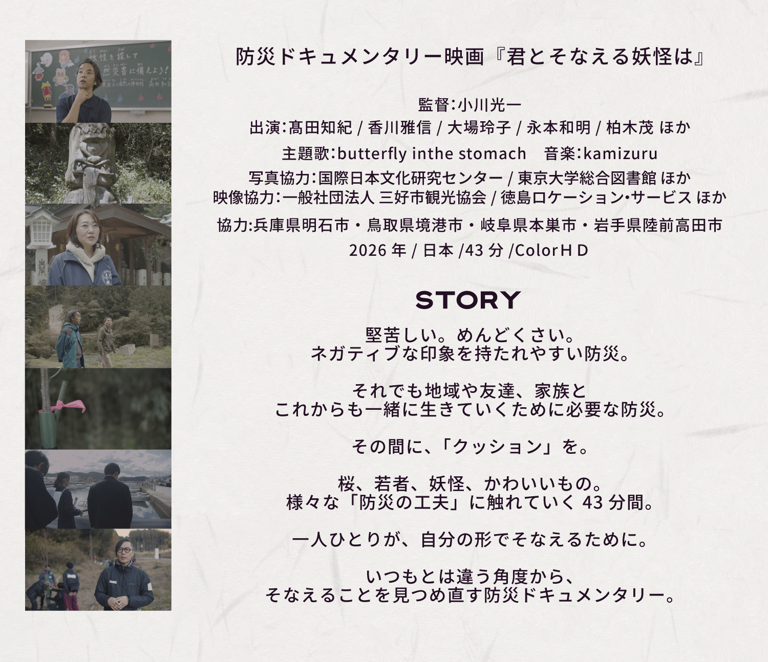 「堅苦しい」「めんどくさい」など、ネガティブな印象を持たれやすい防災。その一方で、この映画では「桜」「若者」「妖怪」など、様々な「防災の工夫」に触れることができます。ただ単純に「災害は怖いから」と伝えるのではなく、防災の堅苦しさを和らげる43分間。いつもとは異なる角度から、そなえることの大切さを伝える防災ドキュメンタリーです。