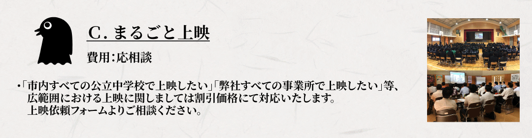 ・同日や翌日等に、同じ主催者が複数上映をする場合、2回目以降の上映を各10%割引いたします。ご相談ください。