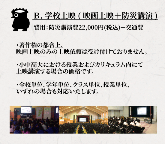 当防災学習ドキュメンタリーの上映会開催をご検討くださり、誠にありがとうございます。市区町村主催の防災イベント、学校主催の授業上映、企業主催の研修上映、有志主催の上映イベント等、様々な上映依頼を受け付けております。各コミュニティにおける防災力の向上にお力添えすることができれば幸甚です。