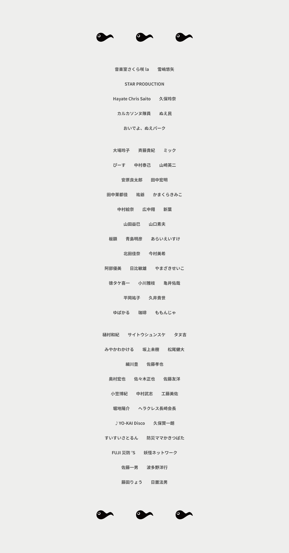 「きみそなサポーター」とは、防災ドキュメンタリー映画『君とそなえる妖怪は』の製作において、様々な支援をしてくださった方々の総称となります。皆さまのサポートに、心より感謝申し上げると共に、当ページ及び映画エンドロールにお名前等を掲載いたします。敬省略の表記にて失礼いたします。